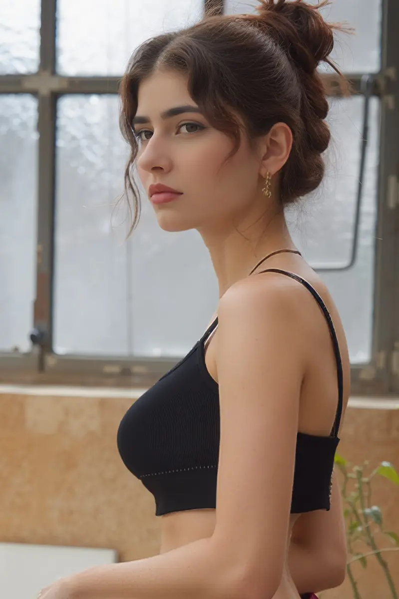 Bring timeless elegance to your essentials with this black seamless Removable pads Cami bra with wide underband. Designed with slim adjustable straps. the light Pads are soft and can be removed if desired, it offers a flattering fit and light support without the discomfort of wires. The stretchable ribbed fabric ensures a smooth silhouette, while the extended underband provides added hold and comfort. Perfect for daily wear, lounging, or styling as a trendy crop top under jackets and shirts, this versatile piece is a must-have for every wardrobe.